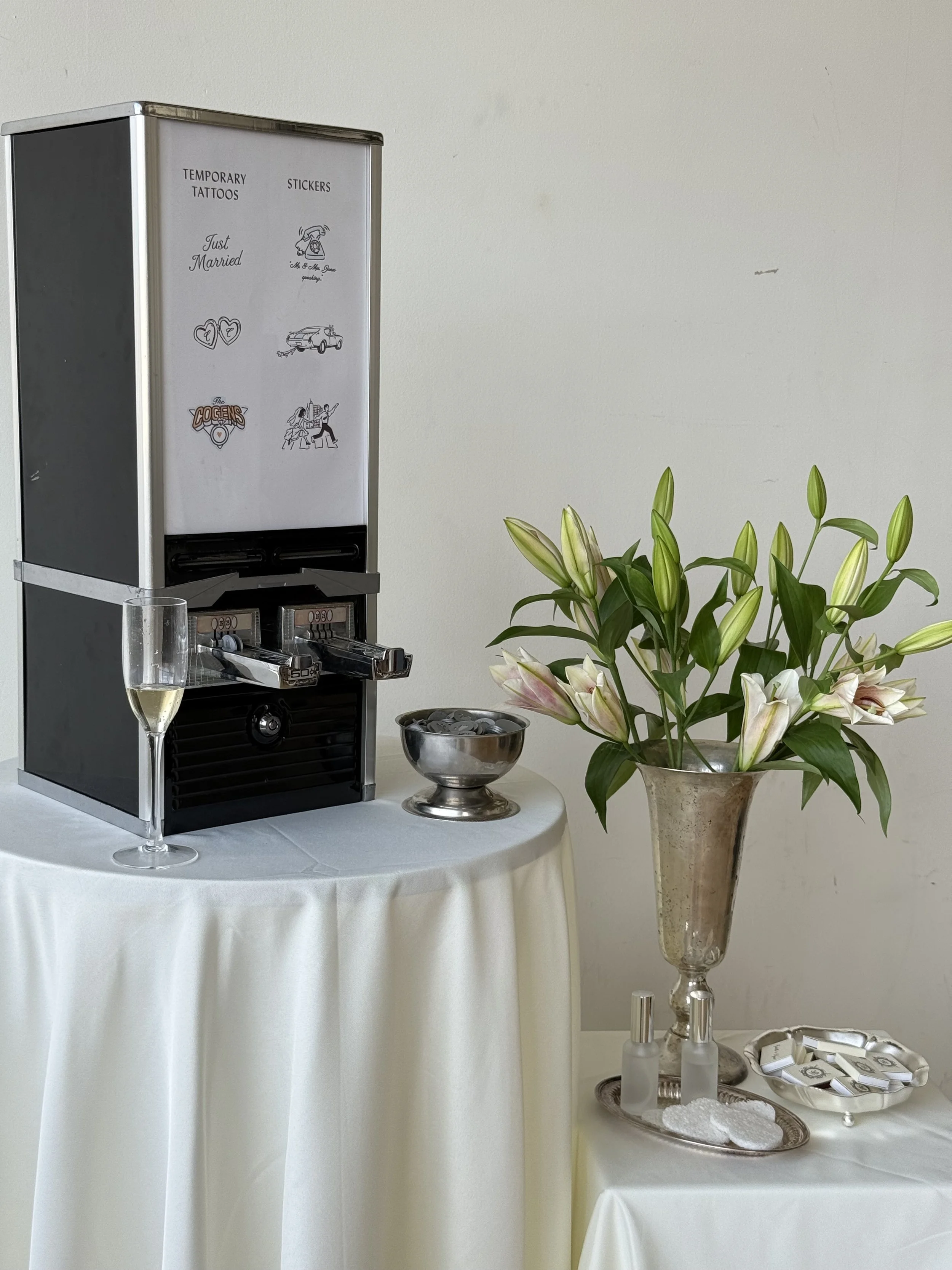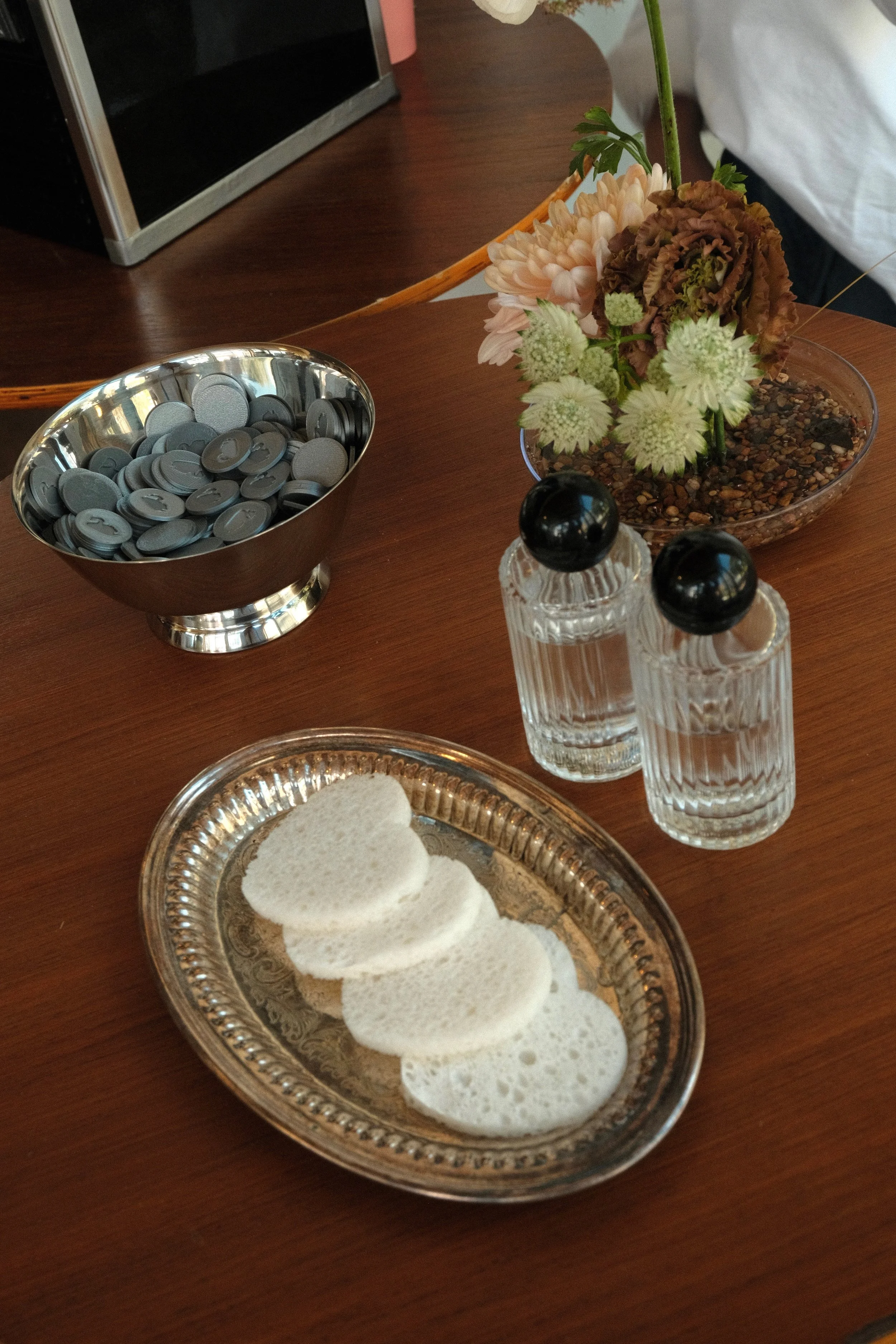 Pour the tokens into the bowl and style the setup as you’d like. If space allows, you’re welcome to incorporate florals or other small details.