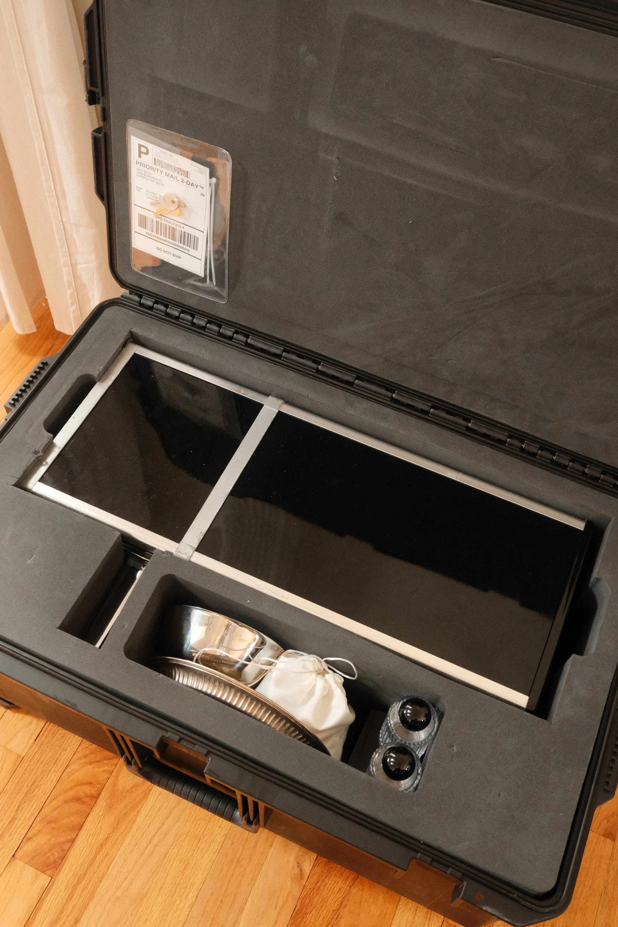 Lay the case flat, clip the zip ties if still attached, and open the latches.